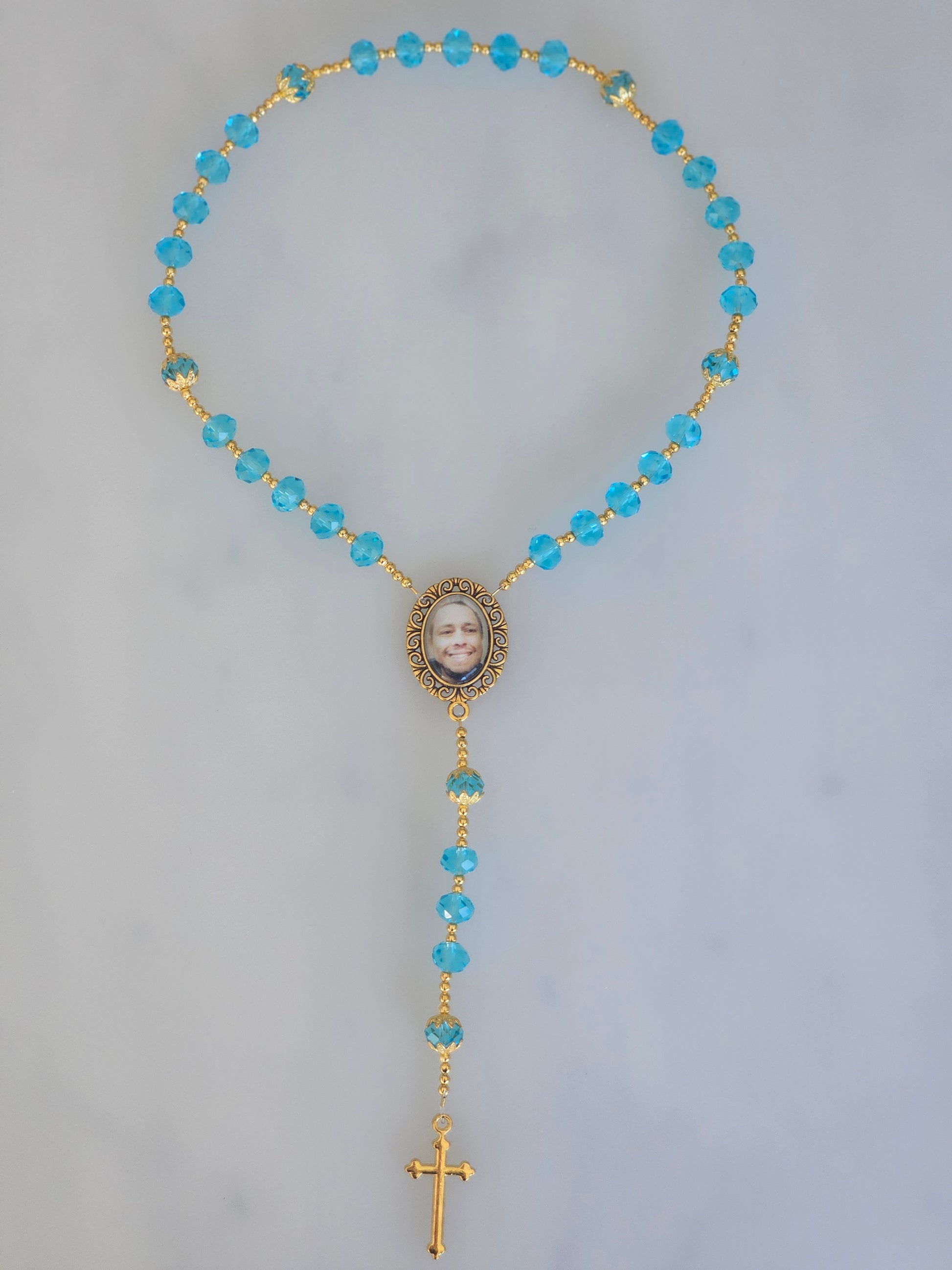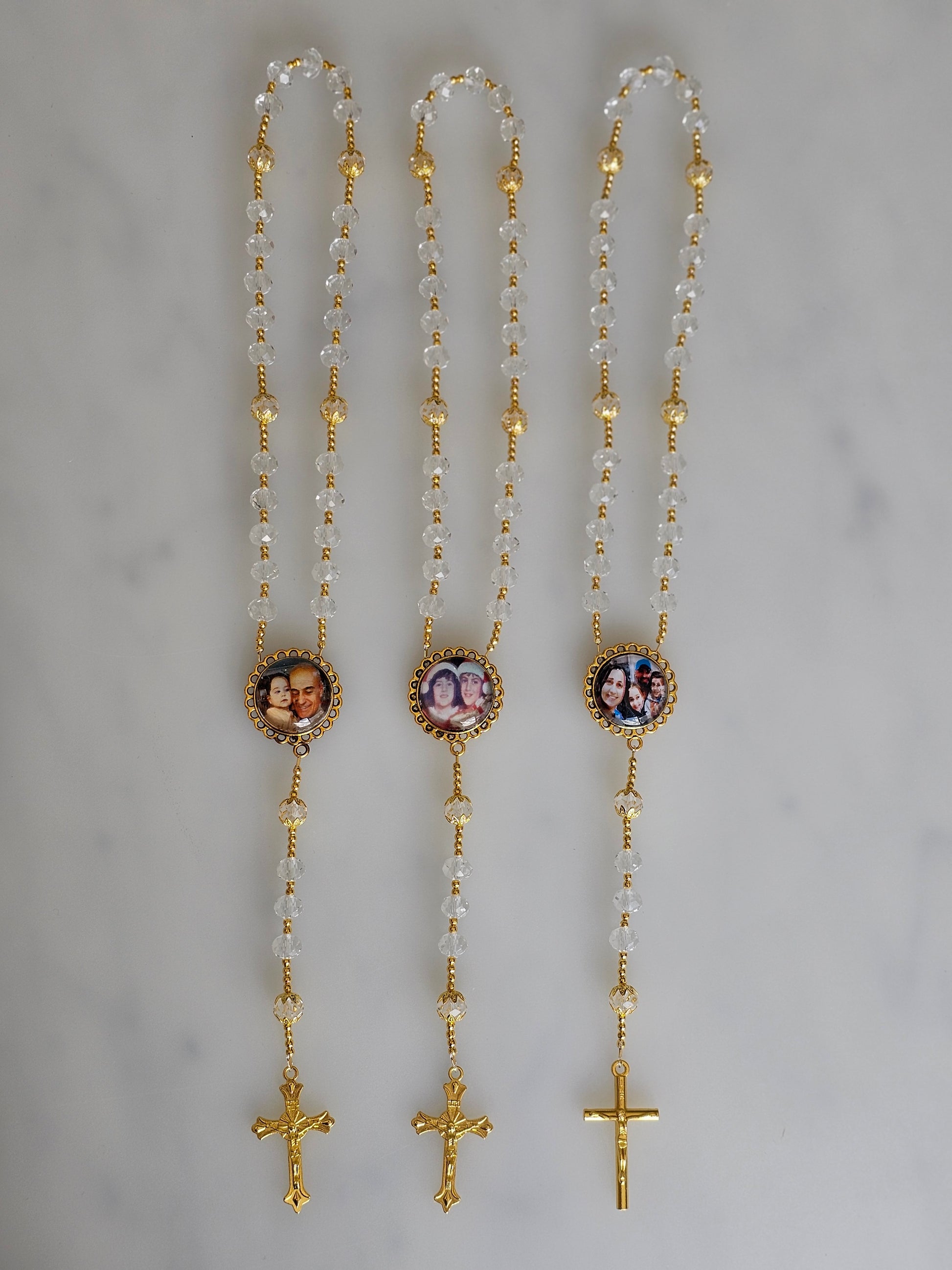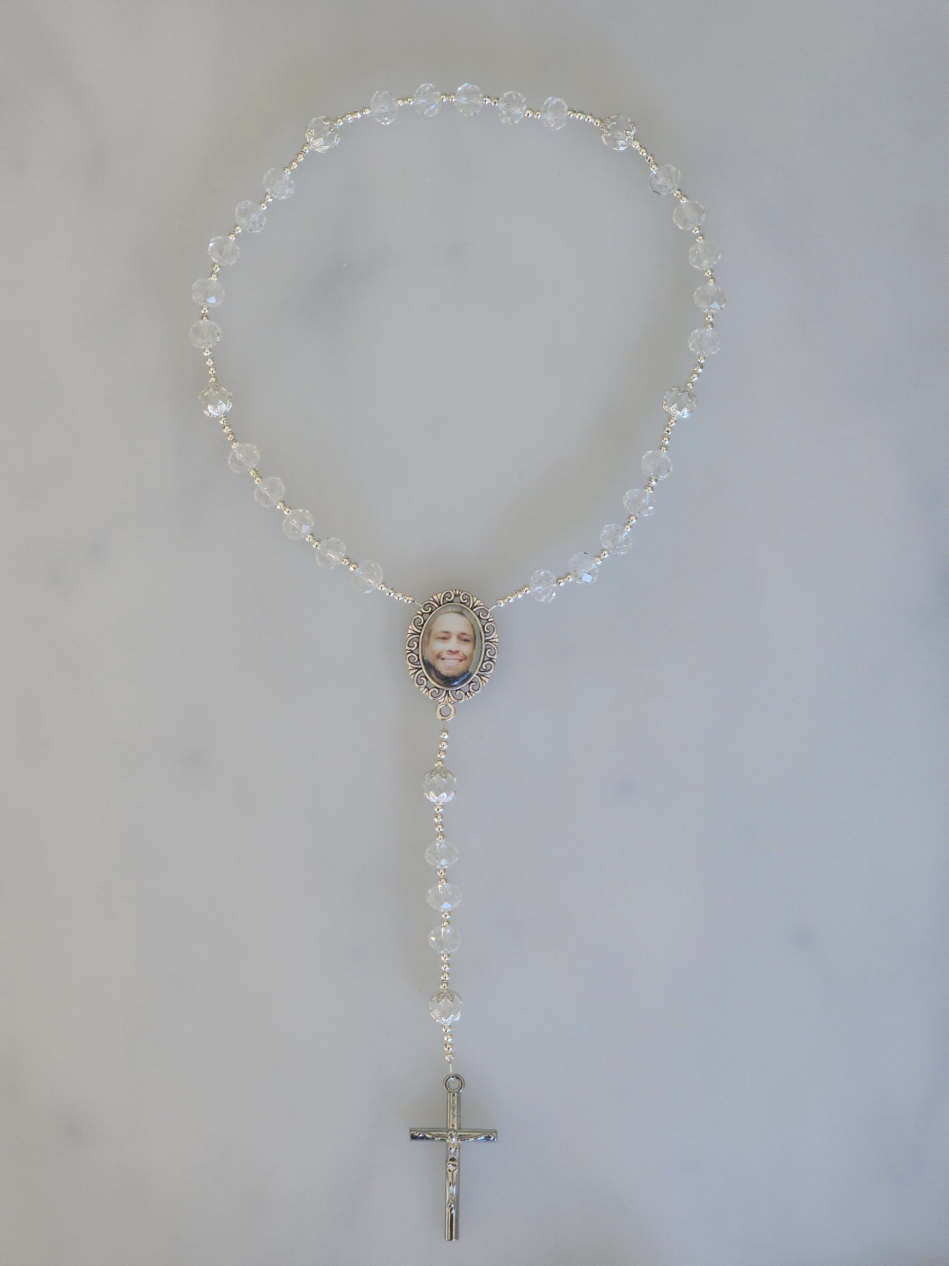 Different colour beads & crosses available. Centrepiece personalised with photo of your choice.